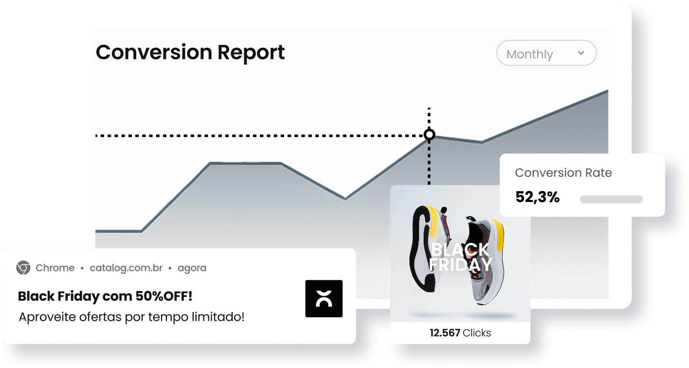 Monitore suas notificações em tempo real, analisando visualizações, cliques e conversões. Ajuste estratégias para otimizar resultados e aumentar conversões.