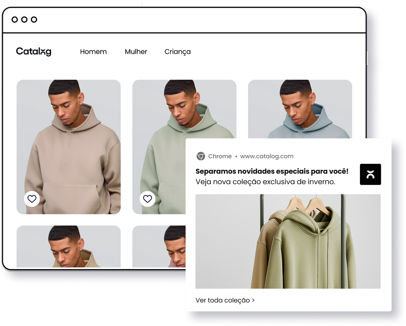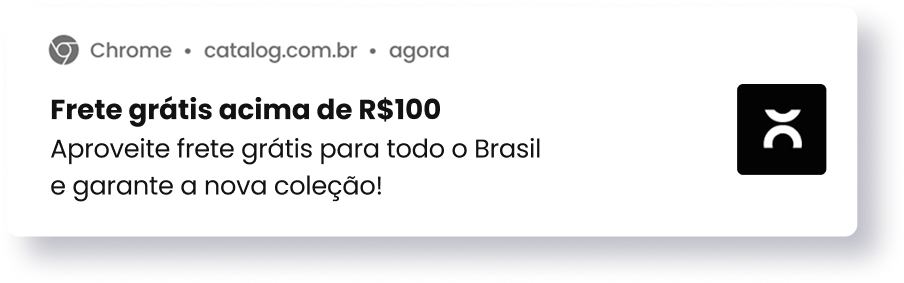 Push Notifications permitem manter contato direto com os usuários, mesmo quando eles não estão navegando no site. Ao enviar atualizações e ofertas relevantes diretamente no navegador, mantenha o cliente engajado e envolvido com a marca, tornando-a mais presente no dia a dia.